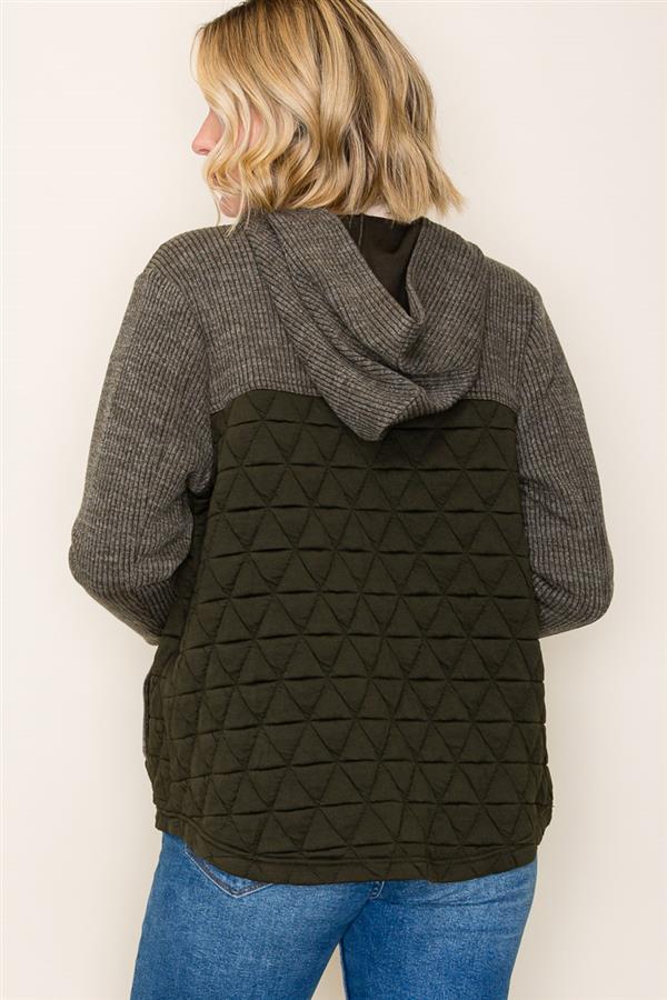 Embrace cozy fall and winter vibes with this Dark Olive Quilted Sweater Jacket! Made from soft long sleeve sweater fabric, it features a button-down front and a fun hoodie for extra warmth. With handy front pockets to tuck in your hands or essentials, it’s the perfect mix of comfy and cool for those chillier days.